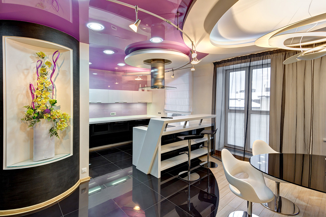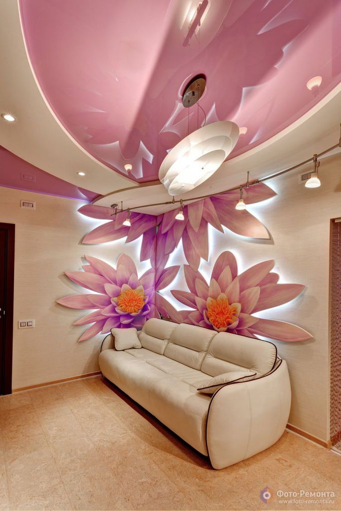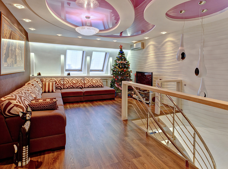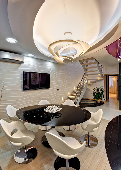Гостиная расположилась над столовой и имеет с ней одну общую стену с рельефным декором.