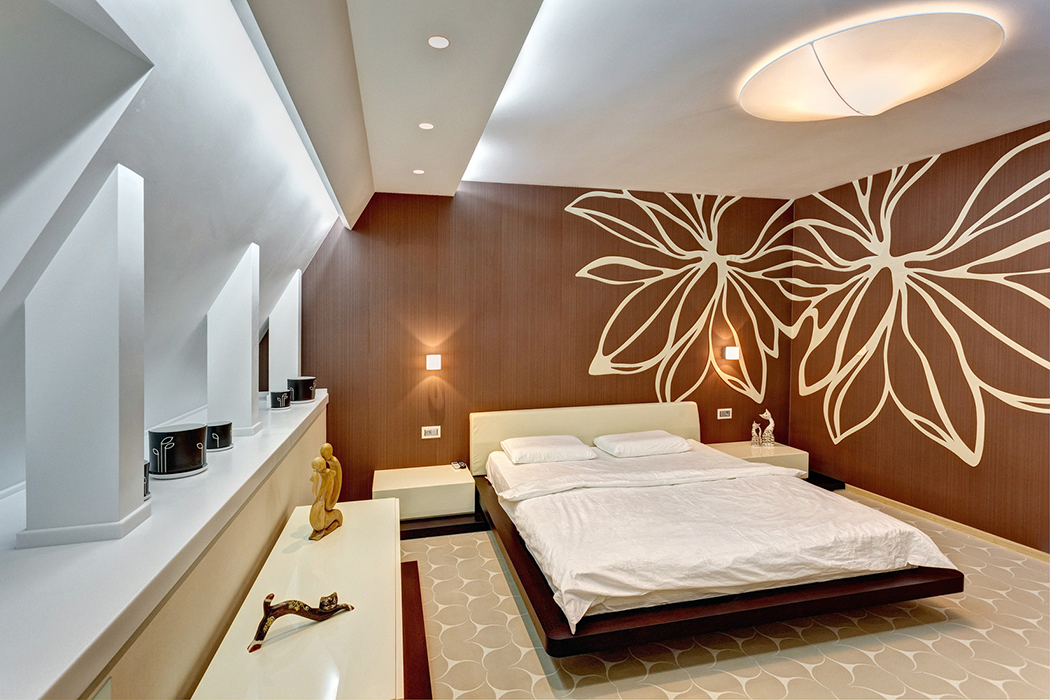 В спальне пилон с зеркалом делит комнату на зону с кроватью и гардеробную. С одной стороны на нём зеркало (и мы видим в отражении туалетный столик), на другой стороне, обращённой к кровати - телевизор.