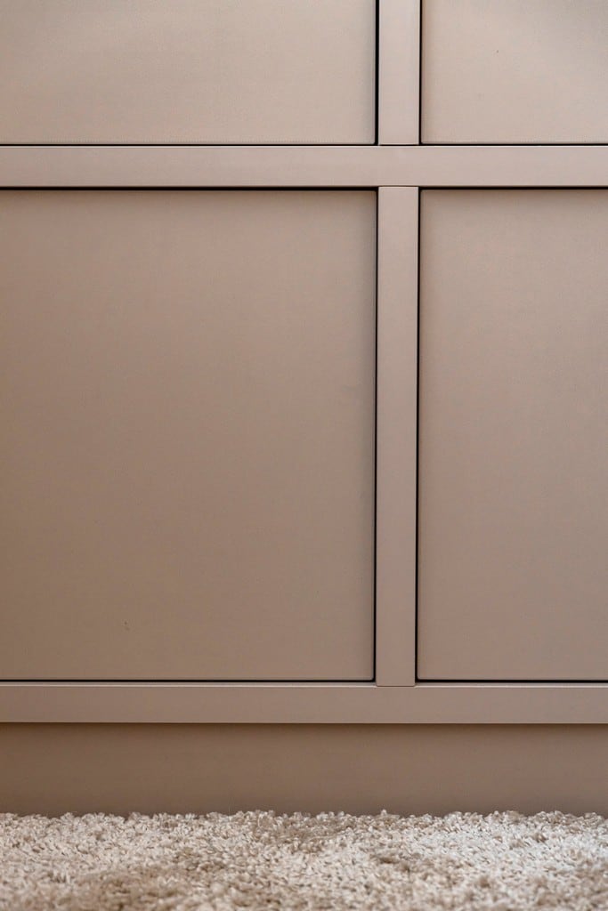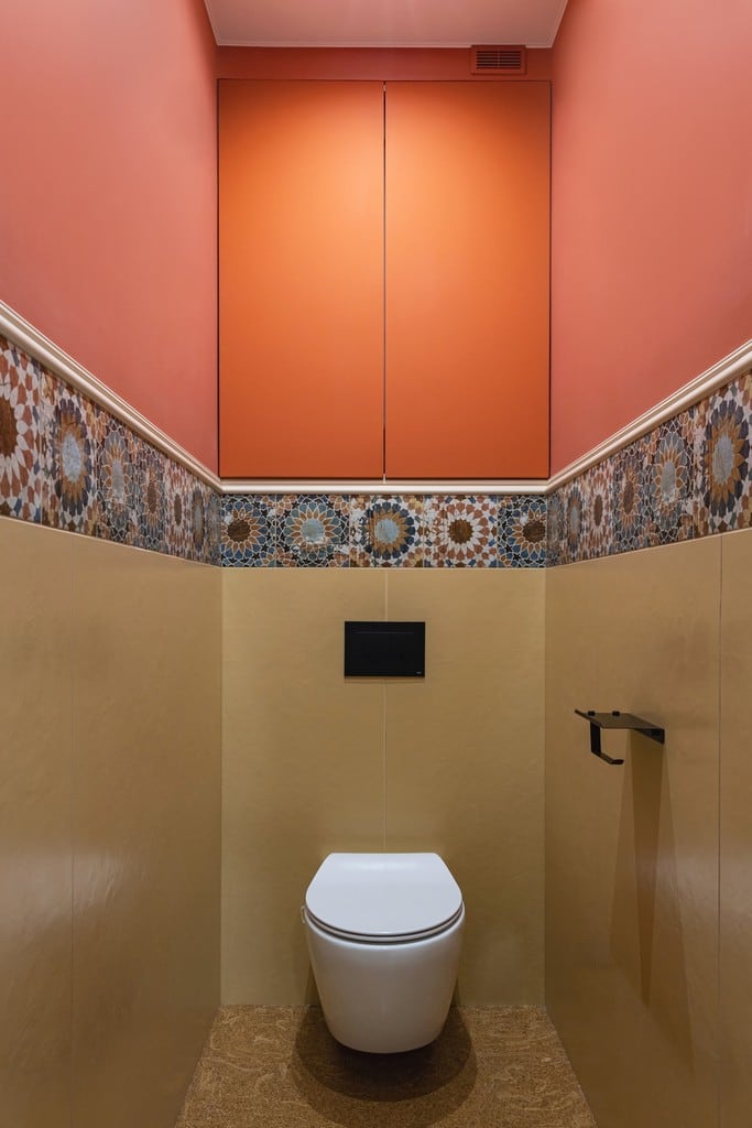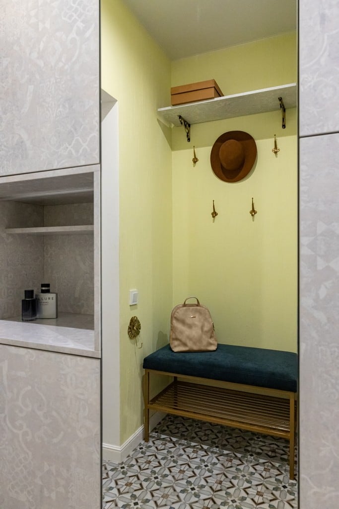 В процессе перепланировки были поменяны местами ванная и туалет для максимально функционального использования пространства. Так как трубы и счетчики удобно спрятать за фасадами над инсталляцией в туалете, а образовавшуюся нишу у столба (смотри план) задействовали под шкаф для хранения с открытой нишей в прихожей. Удобно положить ключи и документы при входе на полку.