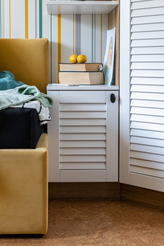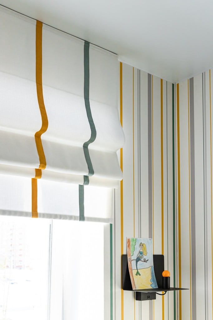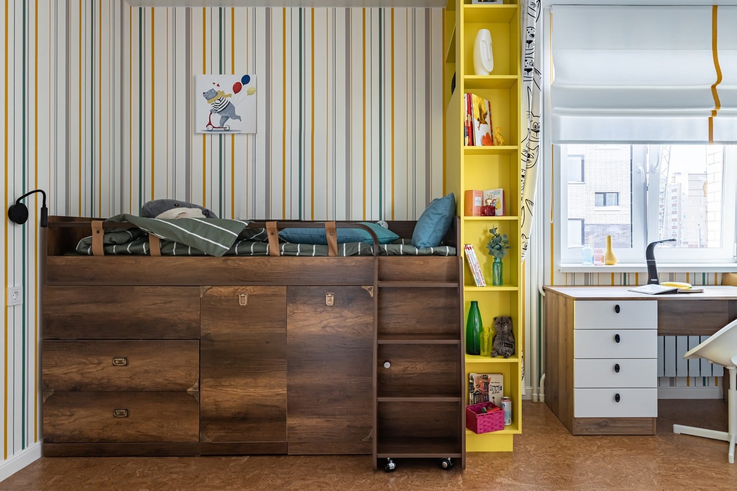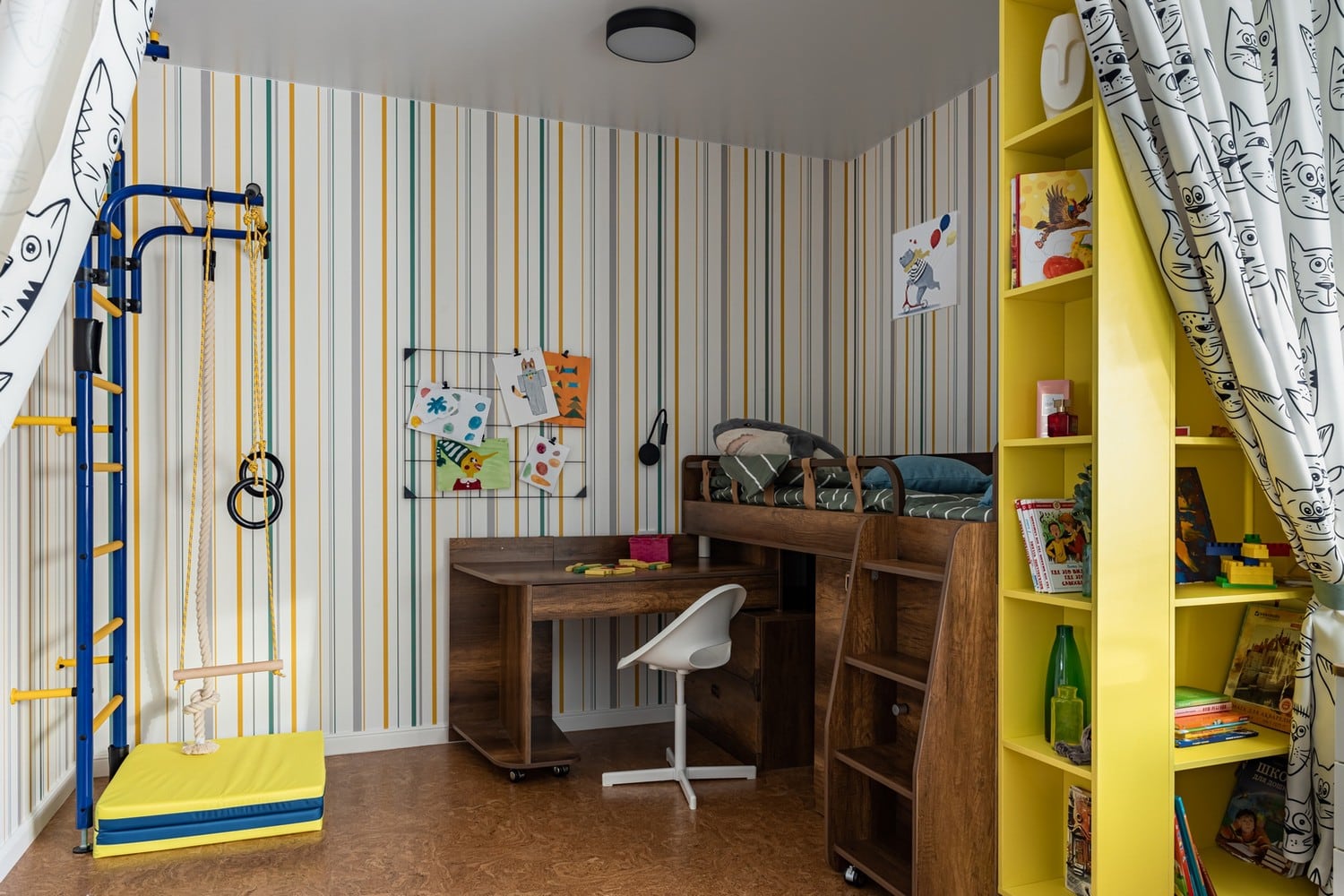 Планировка детской - оказалась самой сложной задачей, так как дети разнополые, с разницей в возрасте 9 лет. Каждому ребёнку определили свой уютный уголок, в котором они могли «отделиться» с помощью шторки. Дочка учится в школе, сын ещё только пошёл в детский сад. Зона с окном досталась дочке, где расположили письменный стол. В ее уголке есть все, что нужно каждой девочке - вместительный шкаф, уютная кровать, стол и полки для учебников и игрушек, и, конечно же, туалетный столик. Концептуальный желтый цвет идеально подошёл для детей, он не имеет гендерной принадлежности в сознании людей, как синий и розовый...