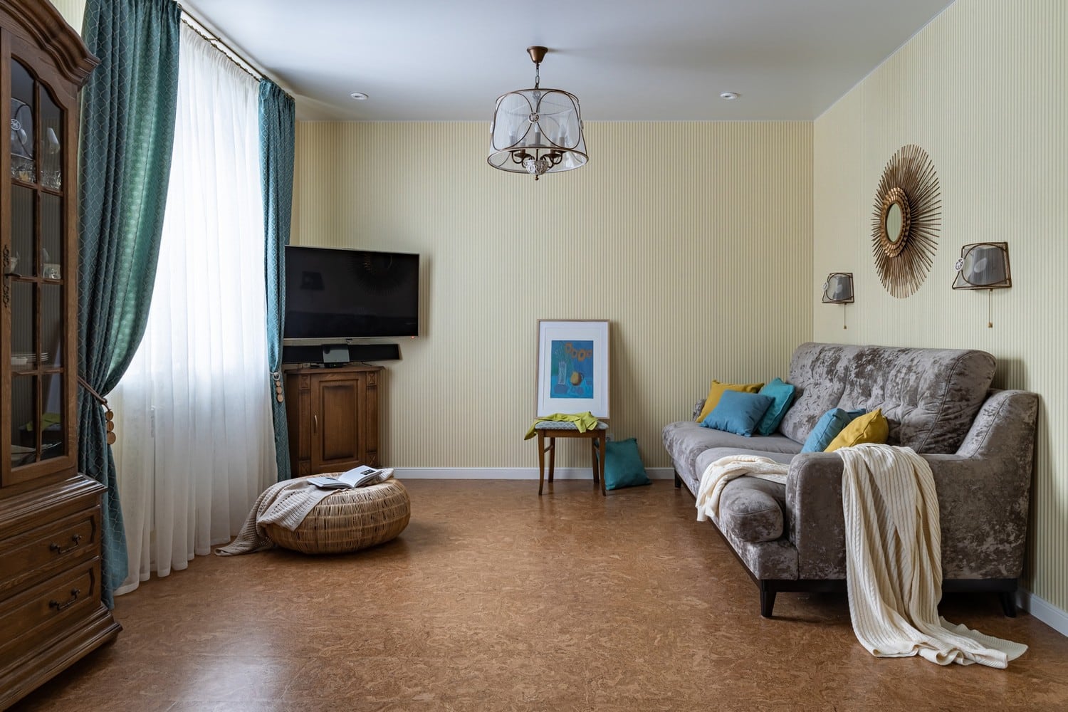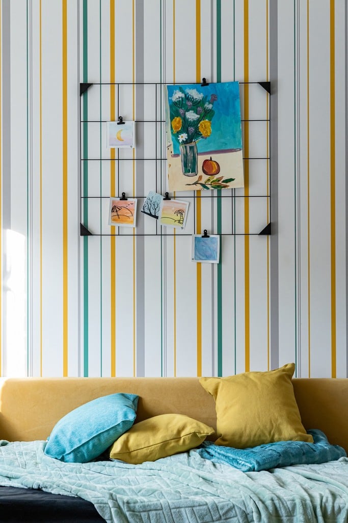 Зеркало-солнце напротив окна в гостиной, как сердце концепции, служит тем самым солнцем, которое отражает падающий свет, и пробегает по всей комнате сквозь перламутровые обои цвета «неаполитанский желтый».