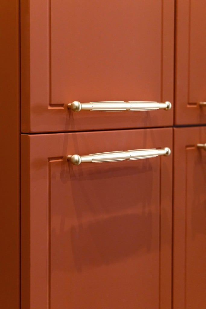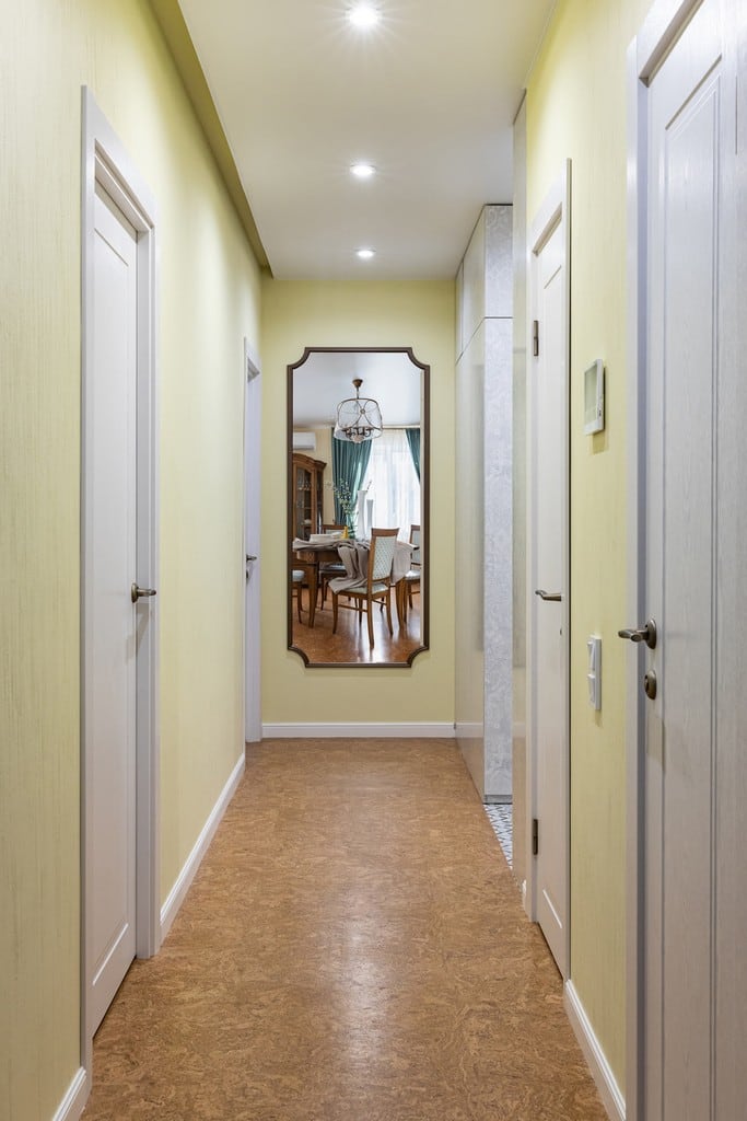 Удачная планировка квартиры отделила грязную зону, где хозяева разуваются при входе в дом. Весь хоз.блок и верхняя одежда сосредоточены в прихожей. Каждая ниша задействована. Отсутсвие ручек на шкафах - не случайно, таким образом мы маскируем шкафы под стены.