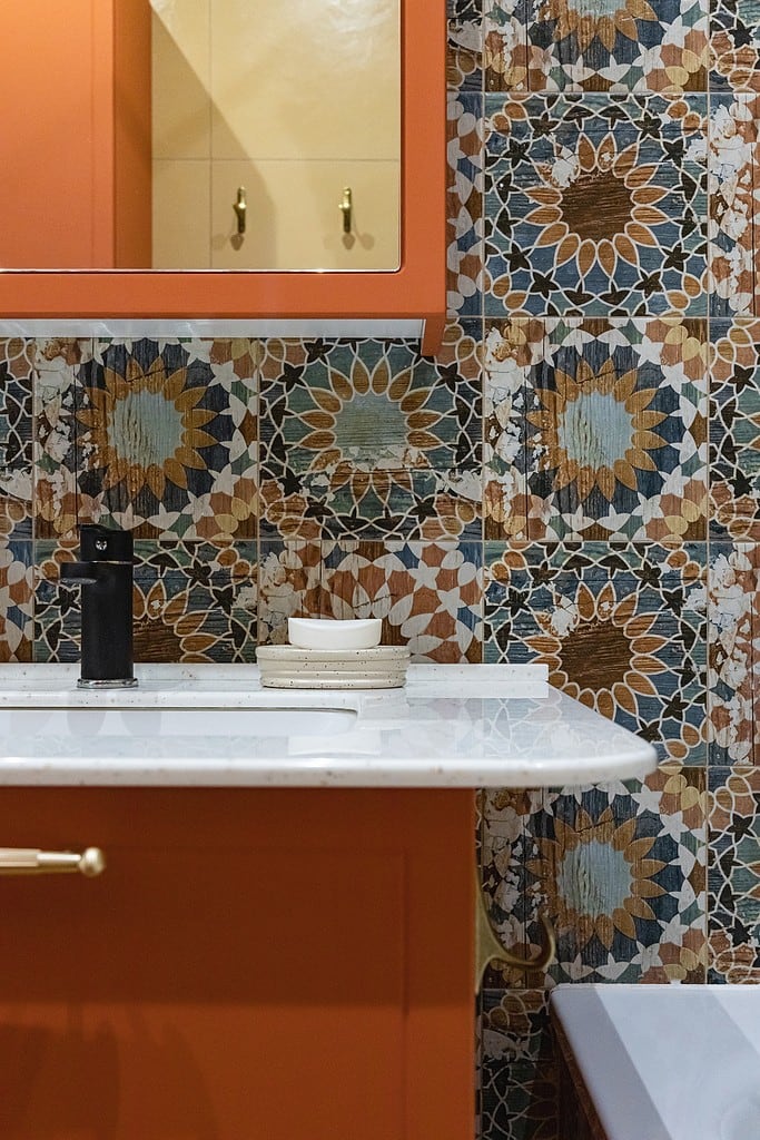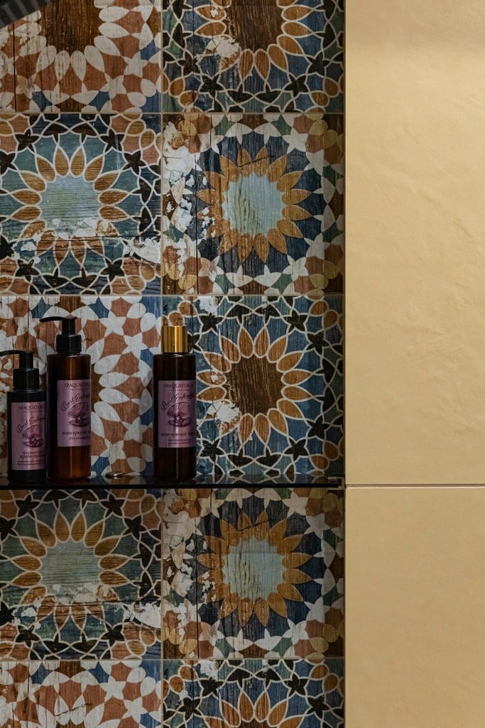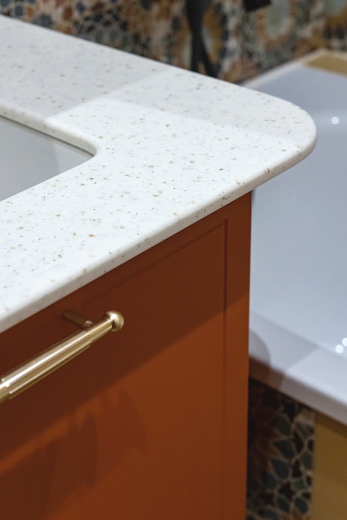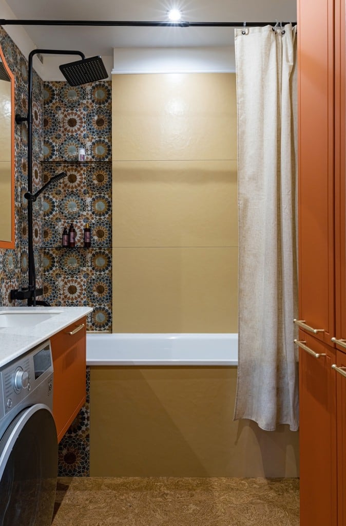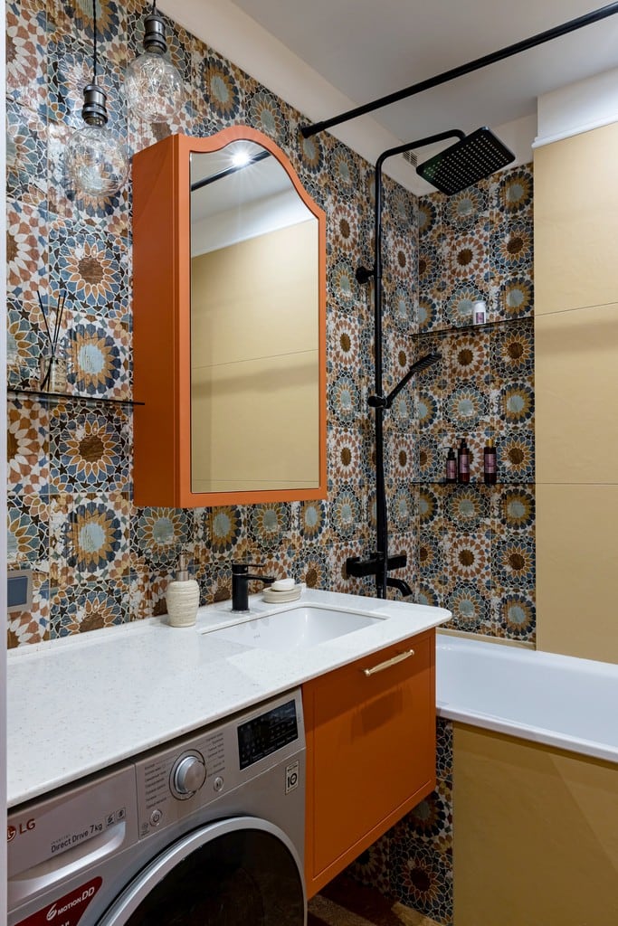 За счёт коридора было увеличено пространство санузлов, чтобы поместить раковину и стиральную машину в ряд под единой каменной столешницей. Обязательное наличие ниши под шампуни, чтобы не заполнять бортики ванной. Просторный угол позволил расположить вместительный пенал, укомплектованный 2-мя корзинами под грязное бельё и полками под полотенца. Здесь даже продуманы места для полотенец - под столешницей справа от раковины, специально для детей, выше, на стенах - для родителей. Подвесная раковина - тоже функциональное решение, ровно там где начинается тумба, заканчивается скрытый лючок под ванной для доступа к коммуникациям. В случае необходимости, мебель убирать не придётся.