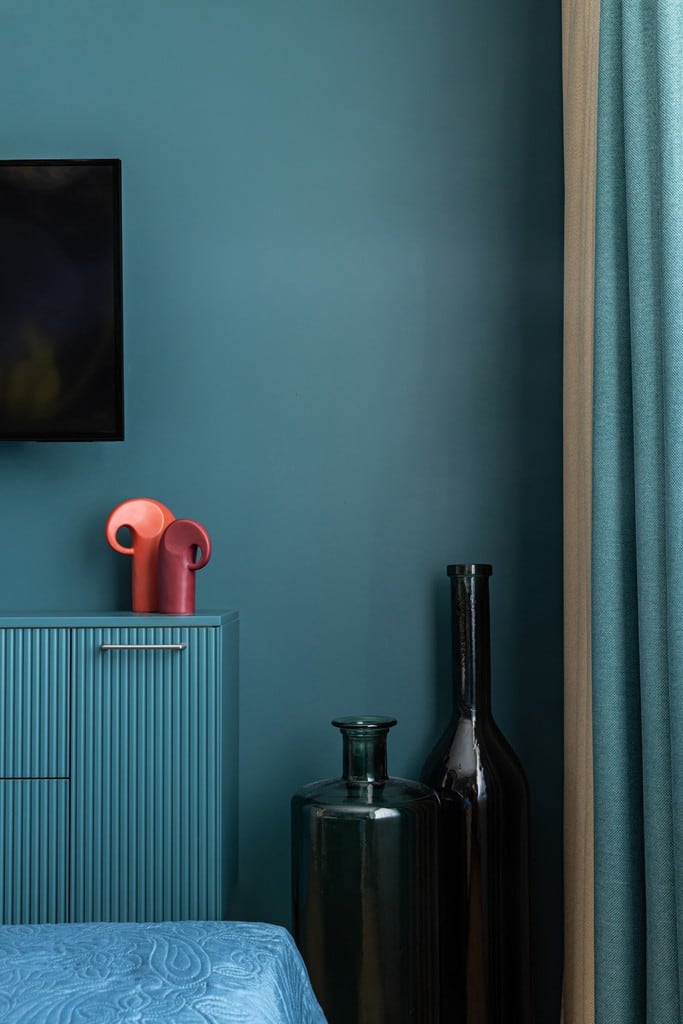 Изголовье спальни погружает в сказочные сны, тёмный цвет стен оттеняет «чёрный квадрат» телевизора. В сказочном принте скрывается дверка в гардеробную - идеальное решение для спальни, освобождающее комнату от габаритных шкафов.