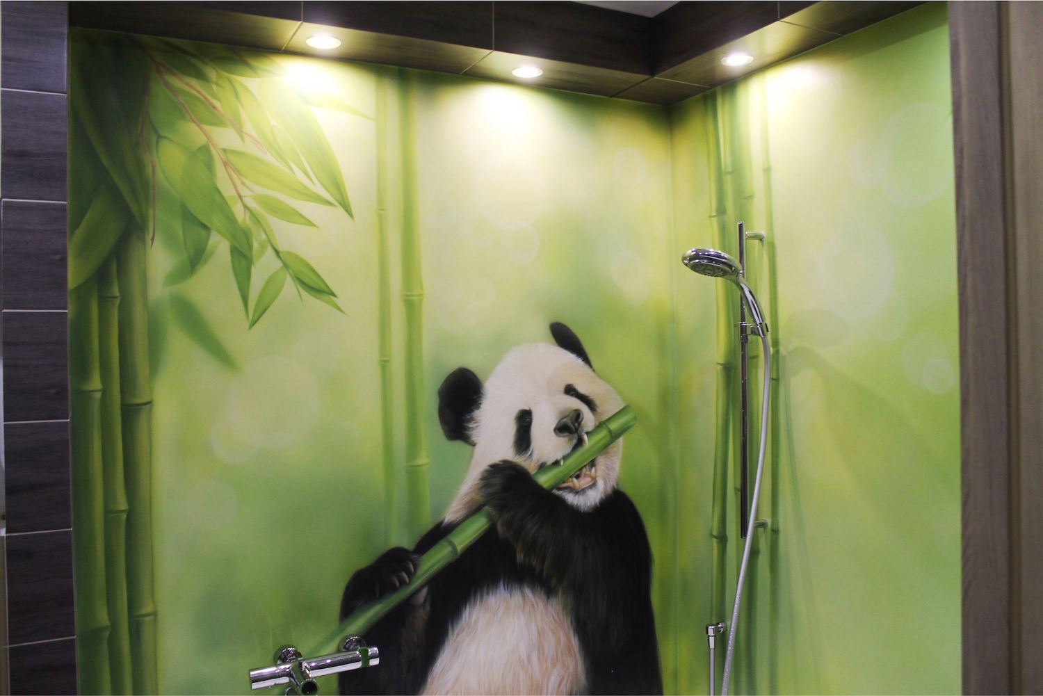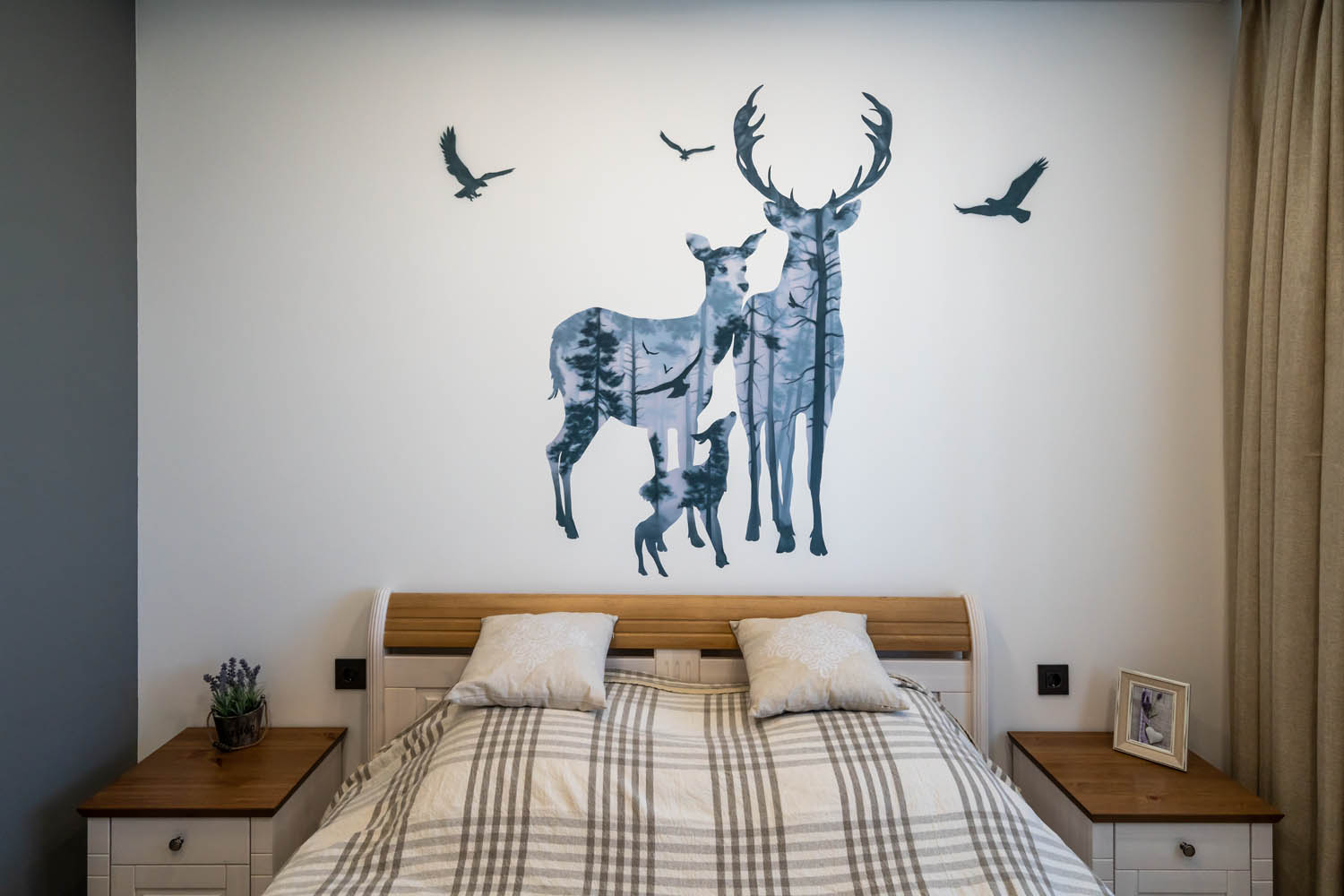 Роспись в спальне с панорамными стеклами, комната абсолютно белая, поэтому роспись сыграла ключевую роль в этом помещении и придала интерьеру сочности.