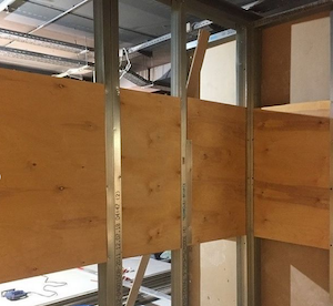 А вот при проектирование вновь возводимых стен, например в гостиной, детской или спальной комнате, где монтируются ТВ, тумбы, стеллажи и полки и т.д. мы на плане перегородок указываем конкретную стену и выносим примечание: «участок стены размером n, необходимо усилить для подвесной мебели». Бригады отделочников эти участки стены традиционно укрепляют фанерой или досками между профилями и поверх зашивают ГКЛ.