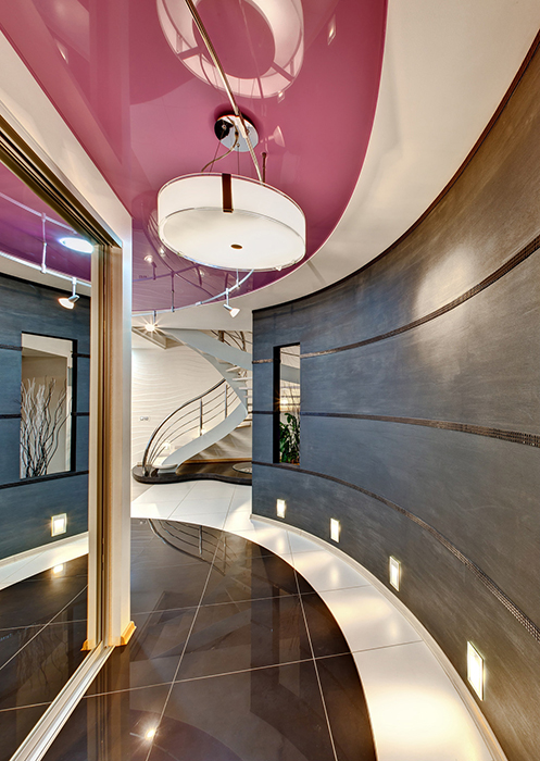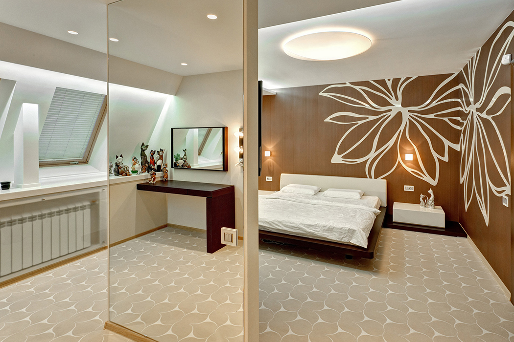 В спальне пилон с зеркалом делит комнату на зону с кроватью и гардеробную. С одной стороны на нём зеркало (и мы видим в отражении туалетный столик), на другой стороне, обращённой к кровати - телевизор.