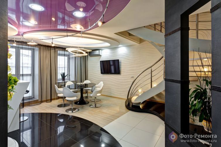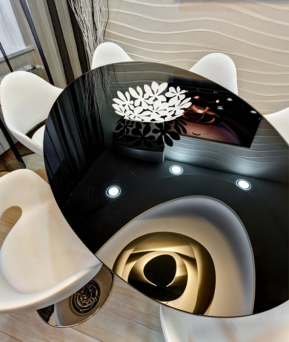 Гостиная расположилась над столовой и имеет с ней одну общую стену с рельефным декором.