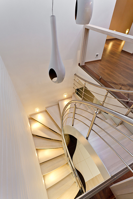 На первом этаже основным помещением является открытое общее пространство кухни и столовой, из которой на 2-ой этаж уходит лестница.