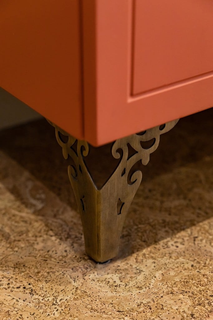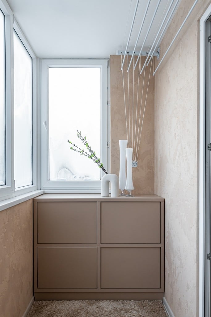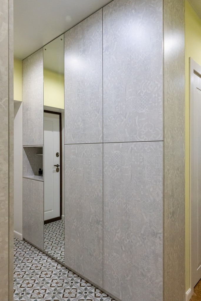 В процессе перепланировки были поменяны местами ванная и туалет для максимально функционального использования пространства. Так как трубы и счетчики удобно спрятать за фасадами над инсталляцией в туалете, а образовавшуюся нишу у столба (смотри план) задействовали под шкаф для хранения с открытой нишей в прихожей. Удобно положить ключи и документы при входе на полку.