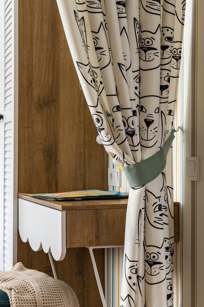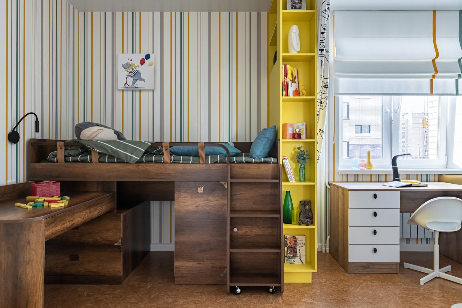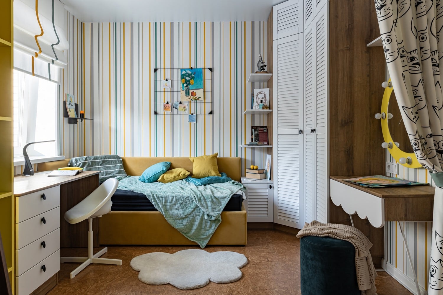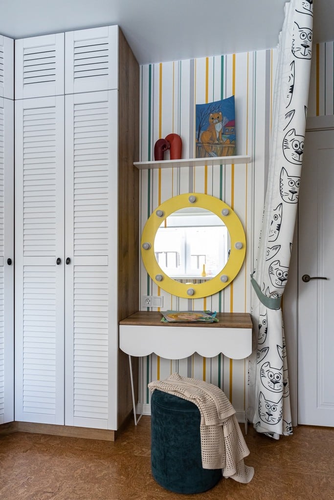 Планировка детской - оказалась самой сложной задачей, так как дети разнополые, с разницей в возрасте 9 лет. Каждому ребёнку определили свой уютный уголок, в котором они могли «отделиться» с помощью шторки. Дочка учится в школе, сын ещё только пошёл в детский сад. Зона с окном досталась дочке, где расположили письменный стол. В ее уголке есть все, что нужно каждой девочке - вместительный шкаф, уютная кровать, стол и полки для учебников и игрушек, и, конечно же, туалетный столик. Концептуальный желтый цвет идеально подошёл для детей, он не имеет гендерной принадлежности в сознании людей, как синий и розовый...