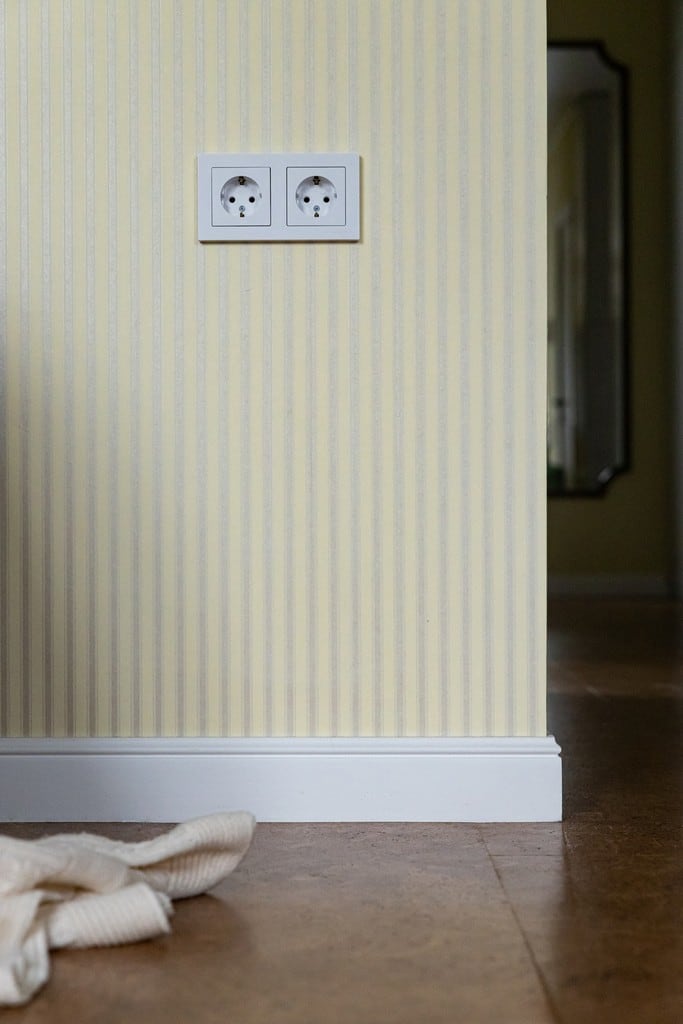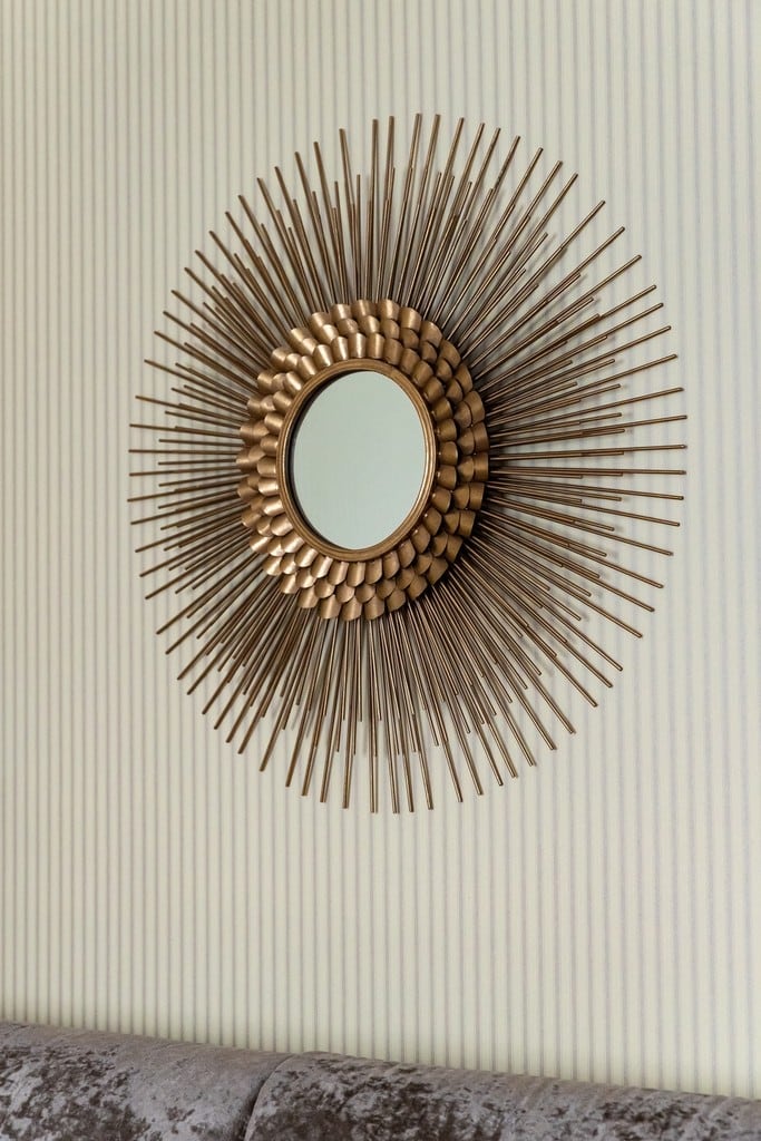 Зеркало-солнце напротив окна в гостиной, как сердце концепции, служит тем самым солнцем, которое отражает падающий свет, и пробегает по всей комнате сквозь перламутровые обои цвета «неаполитанский желтый».