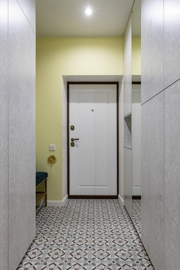 Удачная планировка квартиры отделила грязную зону, где хозяева разуваются при входе в дом. Весь хоз.блок и верхняя одежда сосредоточены в прихожей. Каждая ниша задействована. Отсутсвие ручек на шкафах - не случайно, таким образом мы маскируем шкафы под стены.