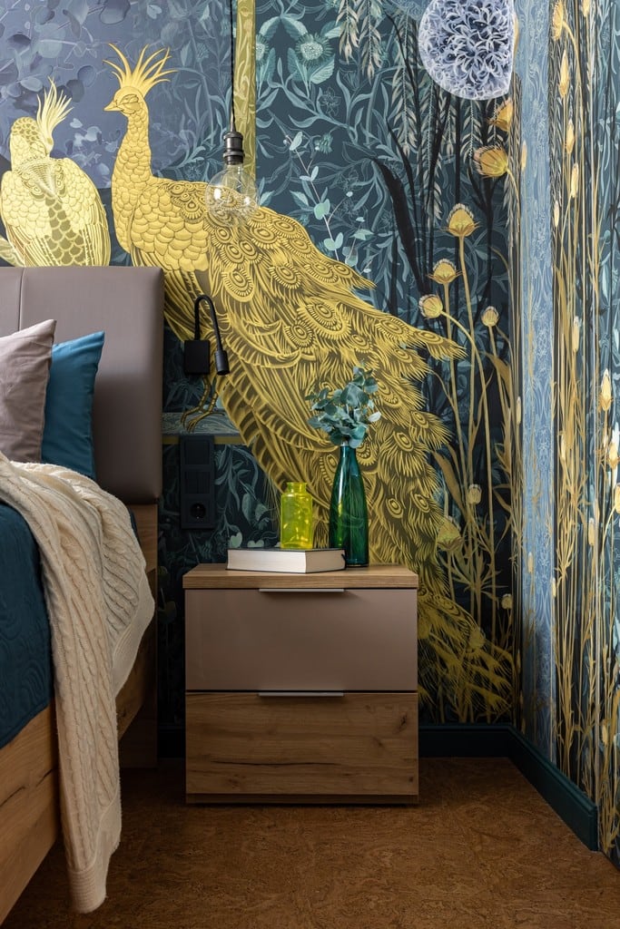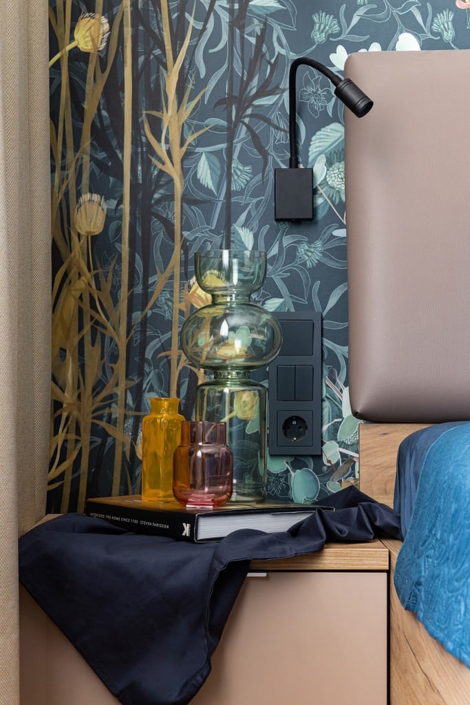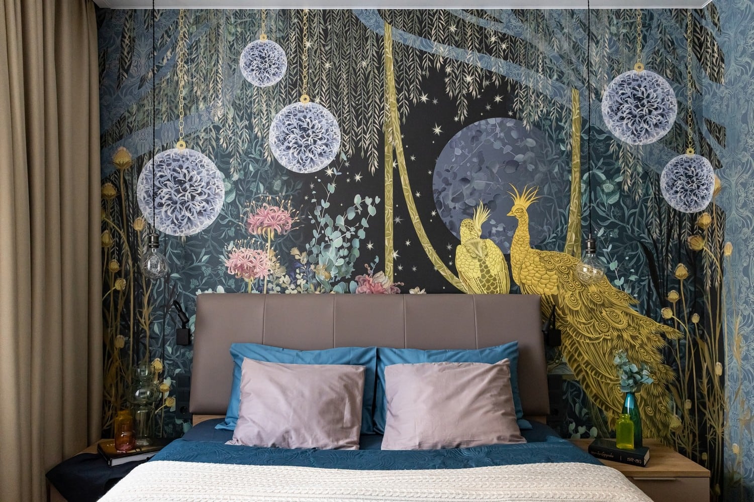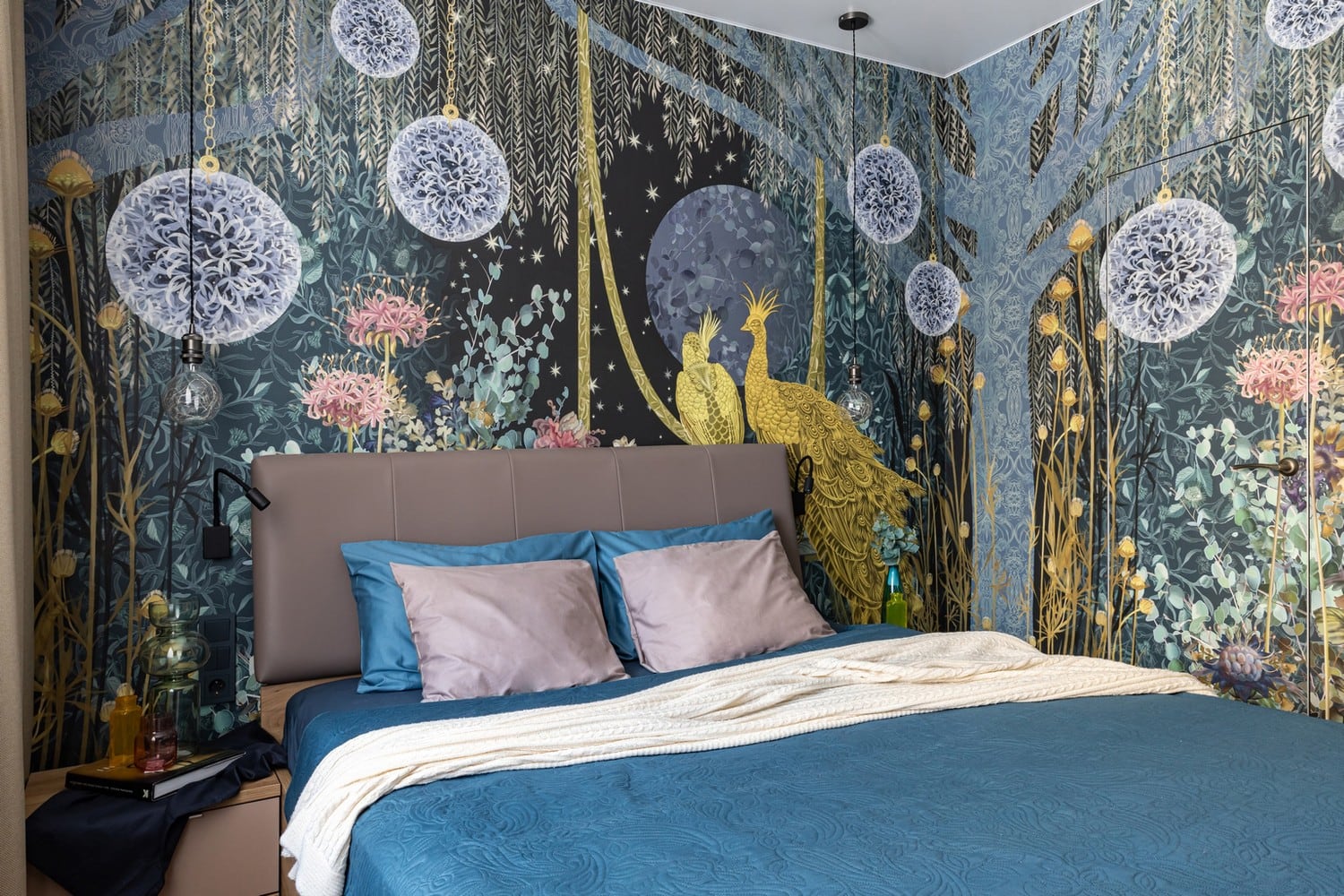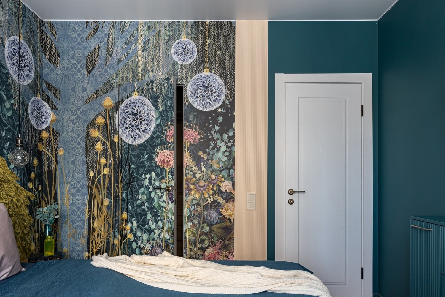 Изголовье спальни погружает в сказочные сны, тёмный цвет стен оттеняет «чёрный квадрат» телевизора. В сказочном принте скрывается дверка в гардеробную - идеальное решение для спальни, освобождающее комнату от габаритных шкафов.