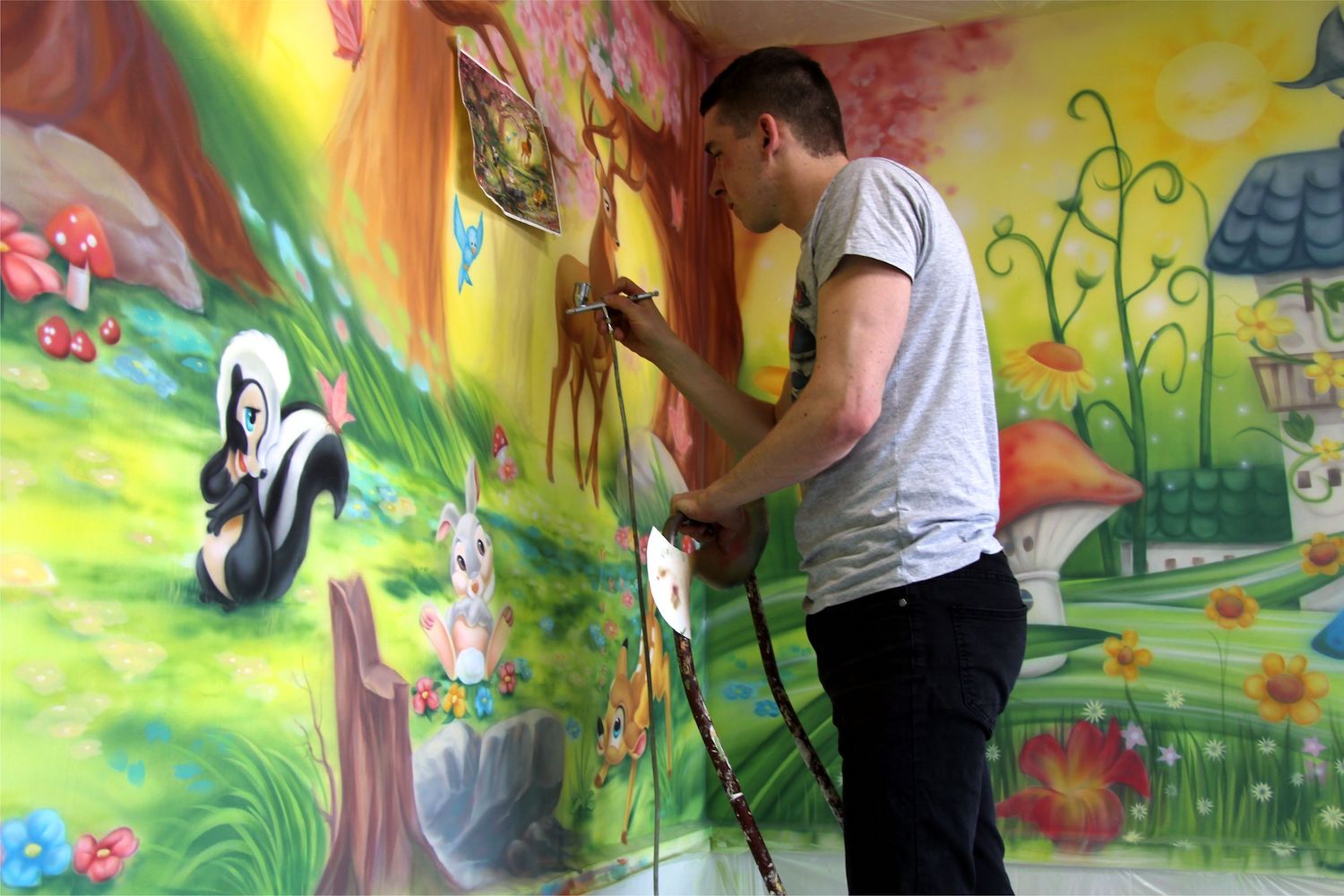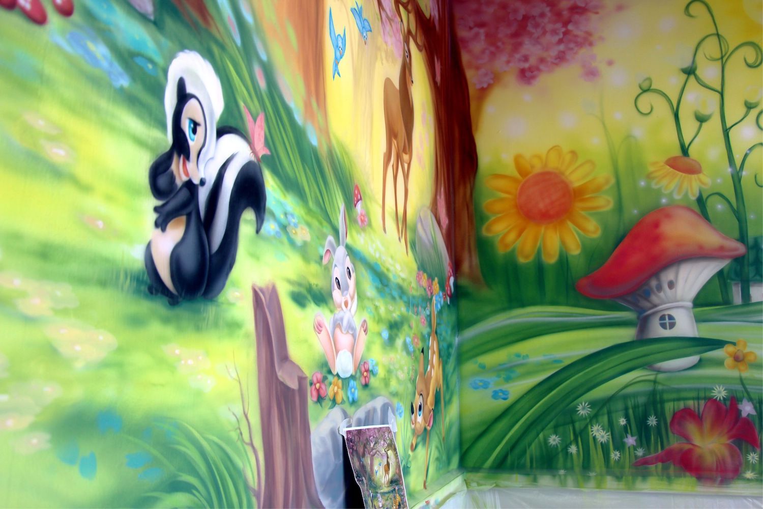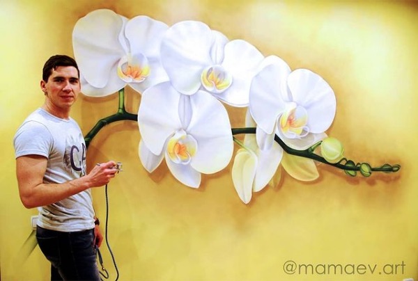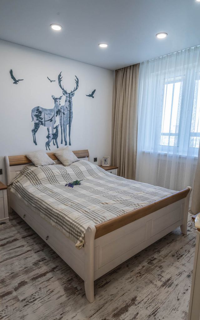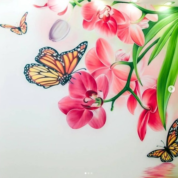 Роспись в спальне с панорамными стеклами, комната абсолютно белая, поэтому роспись сыграла ключевую роль в этом помещении и придала интерьеру сочности.